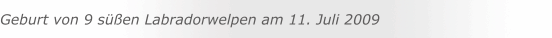Am 11. Juli 2009 hat unsere Labrador-Golden-Retrieverhündin Luna 9 gesunde Welpen geboren. Es sind 6 Hündinnen und 3 Rüden, davon sind 4 Hündinnen und ein Rüde braun und 2 Hündinnen und 2 Rüden schwarz. Deckrüde Timo ist ein brauner Labrador-Deutschlanghaarmix. Die Welpen sind in unserem Ferienhaus an der Ostsee geboren und wachsen hier mit unseren drei Kindern und 2 Katern auf. Anfang September können die Welpen in Berlin abgeholt werden, um in ihren neuen Familien zu leben. Die Welpen können gerne besucht werden!